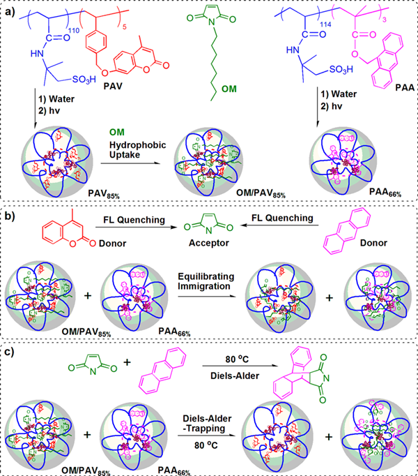It is possible that the hydrophobic guest within amphiphilic polymer micelles may leak out and be captured by other species before polymer micelles adhere to the desired focus because of the complexity in an actual release procedure, rendering the reduced efficiency of the nanocarrier system. To describe such a scenario, two watersoluble fluorescent amphiphilic random copolymers of PAV and PAA with photo-crosslinkable coumarin and anthracene pendants, respectively, were chosen to investigate the equilibrating immigration and maleimide-anthracene-based Diels?Alder-trapping of hydrophobic octylmaleimide guest from one type of photo-cross-linked polymer micelles of PAV85% to another of PAA66% in aqueous solution using the emission and absorption spectra techniques.