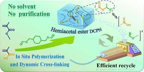 Dynamic covalent polymer networks (DCPNs) can address the recycle or reuse issue of thermosets due to their network rearrangement from the dynamic bond exchange. However, developing DCPNs combining fast reprocessability and high performance through a facile and green method is still a huge challenge. Herein, a facile and green method (in situ polymerization and dynamic cross-linking (ISPDC)) was utilized to produce hemiacetal ester-based DCPNs which exhibited fast reprocessability and high performance. No solvent and no purification were required, and the facile synthesis process also showed readily regulated performance for the DCPNs. The obtained DCPNs could be continuously reprocessed by extrusion as well as compression remolding; meanwhile their solvent resistance, thermo-physical and mechanical properties are excellent on account of their high cross-link density. The small-molecule model reactions and theoretical calculation demonstrated that hemiacetal ester exchange follows a dissociative mechanism without or with an extra carboxyl group. This work studied DCPNs which showed great potential to be efficiently recycled via reprocessing and scaled up. It tallies with sustainable development and contributes to carbon neutrality.