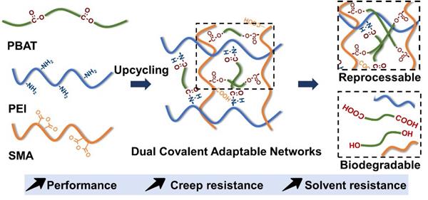Poly(butylene adipate-co-terephthalate) (PBAT), a widely studied biodegradable material, has not effectively addressed the problem of plastic waste. Taking into consideration the cost-effectiveness, upcycling PBAT should take precedence over direct composting degradation. The present work adopts a chain breaking-crosslinking strategy, upcycling PBAT into dual covalent adaptable networks (CANs). During the chain-breaking stage, the ammonolysis between PBAT and polyethyleneimine (PEI) established the primary crosslinked network. Subsequently, styrene maleic anhydride copolymer (SMA) reacted with the hydroxyl group, culminating in the formation of dual covalent adaptable networks. In contrast to PBAT, the PBAT-dual-CANs exhibited a notable Young’s modulus of 239 MPa, alongside an inherent resistance to creep and solvents. Owing to catalysis from neighboring carboxyl group and excess hydroxyl groups, the PBAT-dual-CANs exhibited fast stress relaxation. Additionally, they could be recycled through extrusion and hot-press reprocessing, while retaining their biodegradability. This straightforward strategy offers a solution for dealing with plastic waste.