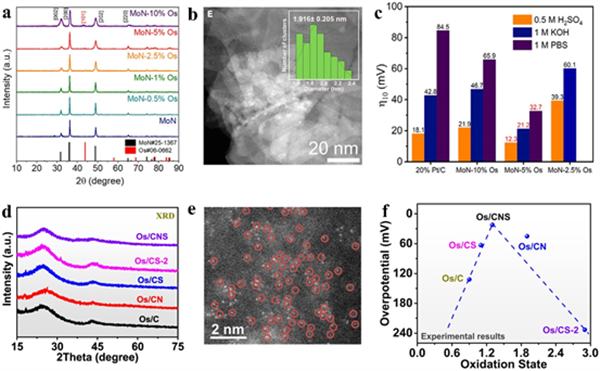 載體工程     將催化劑縮小到納米顆粒、團簇甚至單原子,并與合適的載體混合也是提高催化劑活性和穩(wěn)定性的有效方法之一。由此產(chǎn)生的耦合效應(yīng)、量子尺寸效應(yīng)和可調(diào)配位環(huán)境將充分優(yōu)化催化劑的電子結(jié)構(gòu),從而大大提高其催化活性。此外,載體工程的最大優(yōu)勢是可以實現(xiàn)活性位點的高效利用,特別是對貴金屬,可以控制最終工業(yè)應(yīng)用的成本。例如,最近的研究發(fā)現(xiàn),限制在二維MoN上的Os納米團簇可以有效地優(yōu)化表面電子構(gòu)型,從而提高催化劑的HER性能。在堿性、酸性和中性條件下,其質(zhì)量活性分別是商用Pt/C的10倍、7倍和9倍以上。進一步研究表明,Os和MoN之間的強電子相互作用有利于調(diào)節(jié)表面微環(huán)境,從而加速水的緩慢解離,促進氫的吸附。