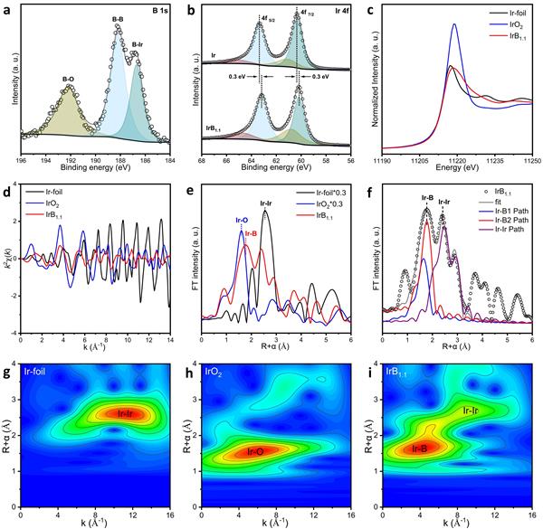 圖2: 催化劑的電子結構(a) IrB?.?的B 1s XPS光譜。(b) Ir和IrB?.?的Ir 4f XPS光譜。(c) Ir箔、IrO?和IrB?.?在Ir L?邊的XANES光譜。(d) Ir箔、IrO?和IrB?.?的Ir K空間振蕩。(e) Ir箔、IrO?和IrB?.?的EXAFS光譜傅里葉變換。(f) IrB?.?的Ir L?邊EXAFS擬合曲線。(g-i) Ir箔、IrO?和IrB?.?的Ir L?邊WT-EXAFS。
