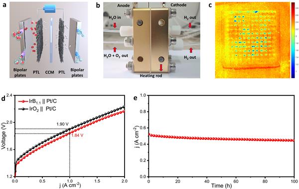 圖4: PEMWE裝置性能(a) 典型PEMWE裝置的示意圖。(b) 典型PEMWE裝置的照片。(c) PTL和壓敏紙的表面應力分布圖。(d) 在80℃下測量的PEMWE極化曲線,利用合成的IrB?.?或商業(yè)IrO?作為陽極,Pt/C作為陰極。(e) IrB?.? || Pt/C的時間相關電流密度曲線。