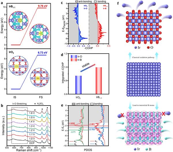 圖6: 穩(wěn)定性改善機制(a) IrB?.?和IrO?中Ir的去金屬化能量。(b) IrB?.?在普通0.5 M H?SO?中記錄的OCP ~1.6 V(相對于RHE)的原位拉曼光譜。(c) IrO?中的Ir-O鍵和IrB?.?中的Ir-B鍵的COHP。(d) IrO?和IrB?.?中費米能級以下的積分COHP比較。(e) IrO?和IrB?.?的PDOS,灰色區(qū)域高亮顯示了反鍵態(tài)。(f) 輕硼誘導的間隙效應對IrB?.?穩(wěn)定性的示意圖。