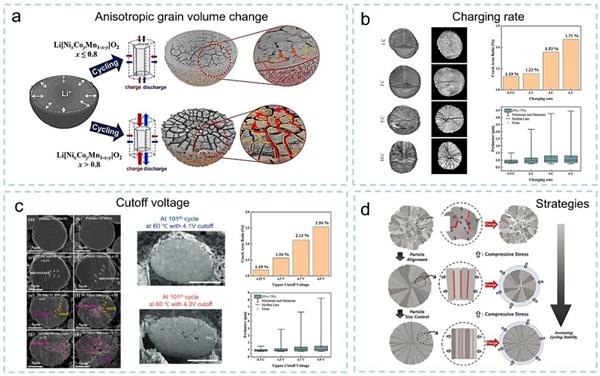 鋰離子在脫出和嵌入時,會引起晶格體積的膨脹和收縮。關鍵在于,這種體積變化是各向異性的。在反復的膨脹收縮下,應力不斷積累,尤其是在高鎳材料中,這種晶格參數變化尤為劇烈。當應力超過材料的承受極限時,就會在一次顆粒內部產生裂紋,即晶內裂紋。