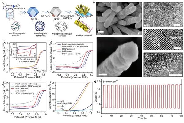 Designing a highly active electrocatalyst with optimal stability at low cost is must and non‐negotiable if large‐scale implementations of fuel cells are to be fully realized. Zeolitic‐imidazolate frameworks (ZIFs) offer rich platforms to design multifunctional materials due to their flexibility and ultrahigh surface area. Herein, an advanced Co–Nx/C nanorod array derived from 3D ZIF nanocrystals with superior electrocatalytic activity and stability toward oxygen reduction reaction (ORR) and oxygen evolution reaction (OER) compared to commercial Pt/C and IrO2, respectively, is synthesized. Remarkably, as a bifunctional catalyst (Ej = 10 (OER) ? E1/2 (ORR) ≈ 0.65 V), it further displays high performance of Zn–air batteries with high cycling stability even at a high current density. Such supercatalytic properties are largely attributed to the synergistic effect of the chemical composition, high surface area, and abundant active sites of the nanorods. The activity origin is clarified through post oxygen reduction X‐ray photoelectron spectroscopy analysis and density functional theory studies. Undoubtedly, this approach opens a new avenue to strategically design highly active and performance‐oriented electrocatalytic materials for wider electrochemical energy applications.