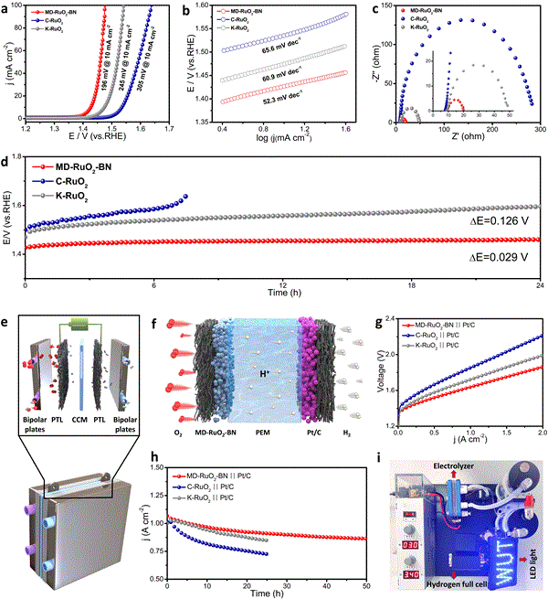 接下來,作者進行了OER性能評價。如圖4a極化曲線顯示,與C-RuO2(305 @10 mA·cm-2)相比,MD-RuO2-BN的過電位較低,僅為196 @10 mA·cm-2,且在OER過程中具有較低的Tafel斜率(圖4b),較小的電荷轉移電阻(圖4c)。加速降解測試和恒流計時電位測定(圖4d)均表明MD-RuO2-BN具有高的OER穩定性。進一步組裝并測試了PEMWE(圖4e, f)。從PEMWE的極化曲線(圖4g)可以看出,以MD-RuO2-BN為陽極催化劑的電解槽提供1 A cm-2的電流密度,僅需1.64 V的電壓,優于C-RuO2 (1.85 V@ 1 A cm-2)。此外,該電解槽在50 h內保持了良好的電解活性(圖4h)。最后,作者設計了自制電解槽與商用氫燃料電池相結合的再生燃料電池系統(圖4i),LED的點亮標志著實現了氫從水中來-還到水中去的綠色循環利用。