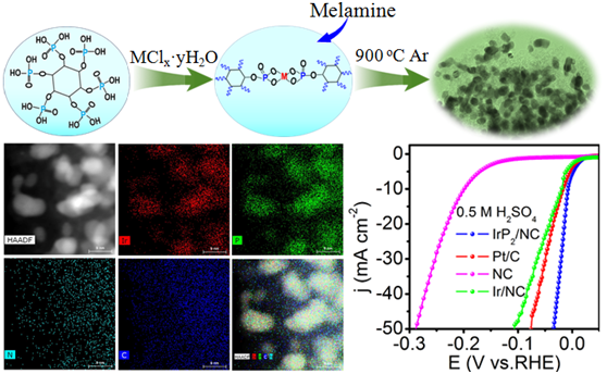 在此基礎上,他們近期進一步研究發現,借助不同的貴金屬鹽及控制前驅體的比例,采用與之前相似的方法可獲得一系列的氮原子摻雜碳封裝富磷型二磷化物貴金屬催化劑(如IrP2、RhP2、Pd5P2等),從而證明該合成方法的普適性。其中制得的IrP2催化劑,當作為酸性析氫催化劑時,僅需8 mV的過電勢即可實現10 mA cm-2的析氫電流密度,顯示出優于商用鉑催化劑(Pt/C)的電催化析氫活性(18 mV@j=10 mA cm-2)。值得關注的是,在酸性條件下,該催化材料還展現出較好的氫氧化反應(HOR)催化活性,有望作為質子交換膜燃料電池陽極電催化劑使用。此外,因受氮摻雜碳的封裝、限域作用,該催化劑亦表現出了明顯優于商用鉑催化劑(Pt/C)的電化學穩定性能。無疑,該項成果將有力推動富磷型金屬磷化物催化劑在電解水制氫、燃料電池及其它領域中的應用。