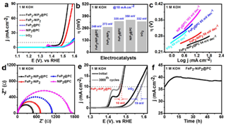 要點1. 所獲得的FeP2-NiP2@PC電催化劑表現出出色的OER活性,在1 M KOH中的過電勢僅為248 mV, 在0.5 M H2SO4(10 mA·cm-2)中對HER的過電勢為極低的117 mV。