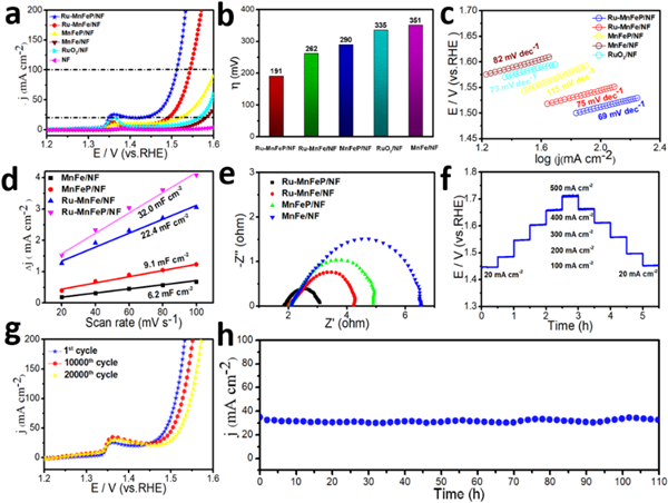 要點1. 實驗發現,Ru–MnFeP/NF電極OER達到20 mA cm-2的電流密度,HER達到10 mA cm-2的電流密度,分別僅需要191mV和35 mV的過電勢。該催化劑的OER和HER活性超過了大多數的過渡金屬磷化物,甚至達到了Pt的HER電催化水平。