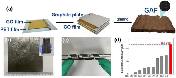 圖 1. (a) GAF 制造過程示意圖。(b) 高溫工藝還原的 120 mm × 120 mm GAF 樣品。(c) GAF 圍繞玻璃棒彎曲。(d) GAF 和報告的電子電導率的比較