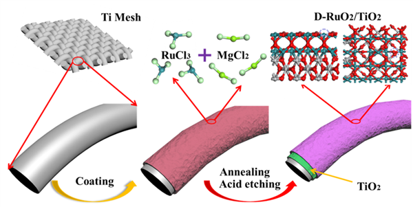 圖2. D-RuO2/TiO2/TM納米異質結構的制備流程示意圖。