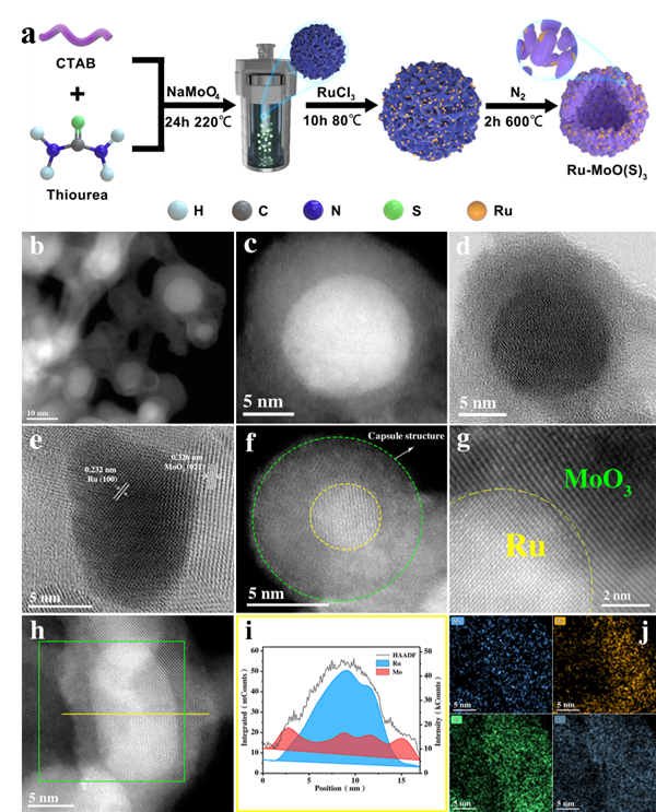 圖1. 合成示意圖及目標樣品Ru@MoO(S)3的微觀結構。