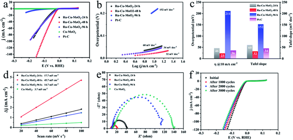 隨后,通過(guò)TEM研究了Ru-Cu-MoO2八面體中空納米結(jié)構(gòu)的形成和演變規(guī)律(圖2)。在NENU-5中加入RuCl3后,Ru3+會(huì)與Cu2+發(fā)生交換,占據(jù)NENU-5中Cu2+的位點(diǎn);隨后,Ru3+開(kāi)始從外到內(nèi)緩慢刻蝕NENU-5表面,隨著反應(yīng)的進(jìn)行,Ru3+逐漸進(jìn)入八面體,破壞NENU-5原有的實(shí)心結(jié)構(gòu);高溫退火后導(dǎo)致結(jié)構(gòu)收縮并結(jié)晶,形成空心納米顆粒。然而,如果反應(yīng)時(shí)間過(guò)長(zhǎng),NENU-5中的Cu2+大部分會(huì)被Ru3+取代,導(dǎo)致八面體結(jié)構(gòu)坍塌。此外,EDS測(cè)試表明,Ru大部分分布于八面體的表面,可為HER提供更多的活性位點(diǎn)。