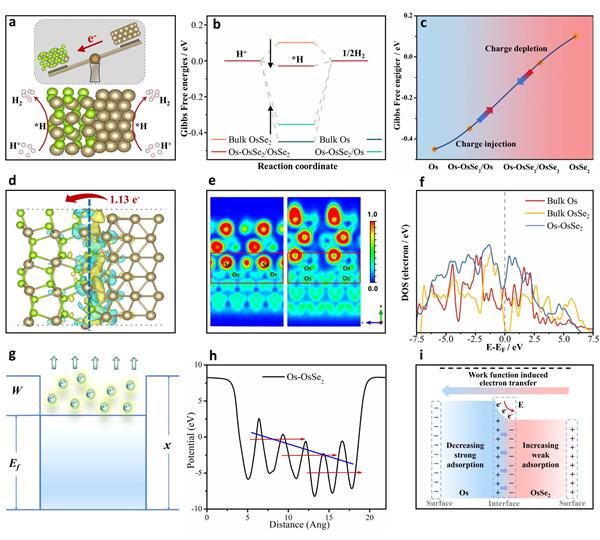 DFT首先計算Os、OsSe2 和 Os-OsSe2 上 HER 過程的吉布斯自由能 (G) 變化。Os、OsSe2、Os-OsSe2/Os 和 Os-OsSe2/OsSe2 中 Os 位點的 H* 吸附量分別為 -0.45、-0.35、0.11 和 -0.03 eV,表明將Os 和 OsSe2 整合成Os-OsSe2可以提高HER 活性。Os在Os-OsSe2中的Os金屬側失去電子,Os的過強ΔGH*被削弱。相反,OsSe2 側的 Os 獲得電子,OsSe2 較弱的 ΔGH* 增強。因此實現氫結合能的雙向優化,賦予Os-OsSe2高HER活性位點。繼續通過差分電荷密度(DCD)進一步探索Os-OsSe2的界面特性和電子變化。Os通過電子相互作用與OsSe2化學鍵合,并且伴隨著界面處從Os到OsSe2的1.13 e- 的電子轉移。另外,電子局域功函確定Os-OsSe2異質結構的界面上存在化學鍵和電子局部分布。二維切片顯示 Os-OsSe2 超晶胞界面處的 Os 和 OsSe2 的化學鍵分配給 Os-Os 和 Os-Se 鍵。得益于界面處的電荷轉移,與純 Os 和 OsSe2 相比,Os-OsSe2 在費米能級附近具有更高的密度態。以上結果表明,Os-OsSe2 上的 HER 過程具有更快的催化動力學和更高的電子電導率。