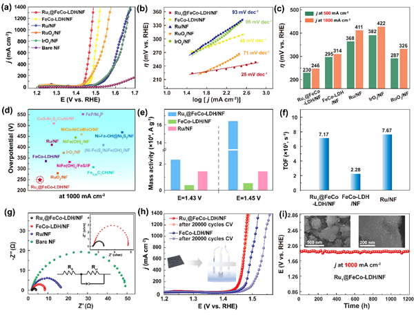 圖3 (a) 1.0 M KOH中的極化曲線;(b)塔菲爾曲線;(c)在500 mA cm-2和 1 A cm-2下的過電位比較;(d) 在 1.0 M KOH 溶液中,與最近報道的1 A cm-2下的OER 催化劑過電位對比;(e) 不同過電位下的質量活性比較;(f) 不同電位下的TOF;(g) 奈奎斯特圖;(h) Ru1SACs@FeCo-LDH和FeCo-LDH在20000圈CV循環前后的極化曲線;(i) Ru1SACs@FeCo-LDH在1 A cm-2電流密度下連續反應1200小時所需的電位隨時間演化的計時電位曲線。