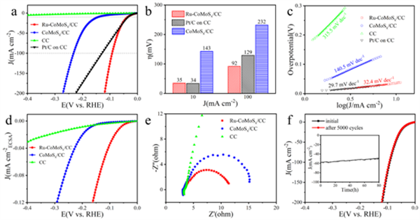 接著,對所獲得的Ru-CoMoSx/CC在堿性介質中的OER及HER性能進行探究。其結果表明,具有協調Ru-Co吸附位點對的Ru-CoMoSx/CC催化劑對堿性OER/HER具有出色的催化活性,分別僅需147 mV和35 mV的過電勢即可達到10 mA cm-2電流密度,并且展示出優異的反應動力學機制及長循環穩定性。