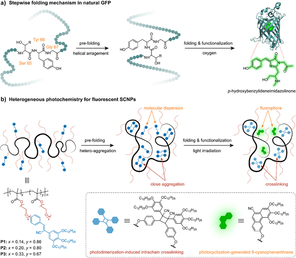 本研究合成了一類新型含氰基苯乙烯(CS)基元的兩親性無規(guī)共聚物。當(dāng)該共聚物在水溶液中進(jìn)行預(yù)折疊時,聚合物鏈中隨機分布的CS基元表現(xiàn)出獨特的異質(zhì)聚集行為,具體表現(xiàn)為兩種不同的聚集狀態(tài):緊密聚集態(tài)和單分子分散態(tài)。值得注意的是,處于緊密聚集態(tài)的CS基元能夠發(fā)生光二聚化反應(yīng),從而實現(xiàn)分子內(nèi)交聯(lián);而單分子分散態(tài)的CS基元則可通過光環(huán)化反應(yīng)生成具有強綠色熒光的熒光團。這種獨特的雙態(tài)特性使CS基元兼具鏈內(nèi)交聯(lián)劑和熒光功能基團的雙重功能,通過雙重光化學(xué)路徑的協(xié)同作用,成功實現(xiàn)了SCNP的鏈內(nèi)折疊和熒光功能化。
