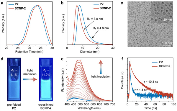 本研究合成了一類新型含氰基苯乙烯(CS)基元的兩親性無規共聚物。當該共聚物在水溶液中進行預折疊時,聚合物鏈中隨機分布的CS基元表現出獨特的異質聚集行為,具體表現為兩種不同的聚集狀態:緊密聚集態和單分子分散態。值得注意的是,處于緊密聚集態的CS基元能夠發生光二聚化反應,從而實現分子內交聯;而單分子分散態的CS基元則可通過光環化反應生成具有強綠色熒光的熒光團。這種獨特的雙態特性使CS基元兼具鏈內交聯劑和熒光功能基團的雙重功能,通過雙重光化學路徑的協同作用,成功實現了SCNP的鏈內折疊和熒光功能化。