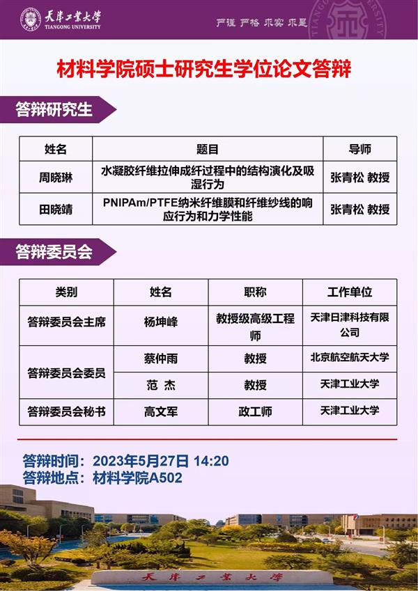 2023年5月27日,天津工業大學材料科學與工程學院A502室舉行了2023屆碩士研究生學位論文答辯會。課題組兩名碩士研究生周曉琳、田曉靖順利通過答辯。