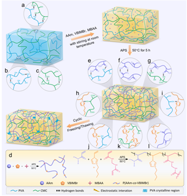 發表在《Mater Horiz》的論文主要制備了一種多功能的離子導電水凝膠,該水凝膠具有高強度、良好的導電性、透明度、抗凍性和抗菌性能。研究人員通過在聚乙烯醇(PVA)和羧甲基纖維素(CMC)的基材中引入交聯的AAm和VBIMBr共聚物網絡,通過自由基聚合反應構建了這種水凝膠。由于共聚物之間的多種相互作用,包括共價交聯、多重氫鍵相互作用和靜電相互作用,所得到的離子導電水凝膠表現出高拉伸強度(360.6 kPa)、大斷裂伸長率(810.6%)、良好的韌性和疲勞抗性能。VBIMBr的引入賦予了PCPAV水凝膠良好的透明度(約92%)、高離子電導率(15.2 mS/cm)和抗菌活性,且在低于零度的溫度下具有良好的柔性和導電性。值得注意的是,該水凝膠具有廣泛的應變范圍(0-800%)、高應變靈敏度(GF = 3.75)、快速響應、長期穩定性和極佳的耐久性,使其能夠檢測到大關節運動和微小肌肉運動。