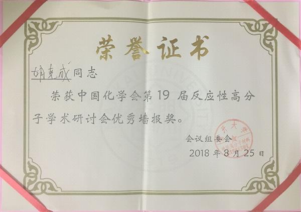 本次優秀墻報獎的評選中,我們實驗室研究生胡克成同學以“可二氧化碳刺激失穩的納米聚合物相界面催化劑”為題的墻報榮獲優秀墻報獎。