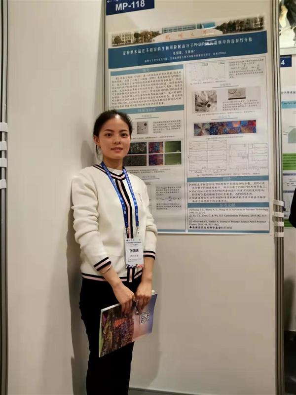 博士生仇亞昕同學就自己的“選擇性溶劑誘導的形狀記憶聚蘋果酸——混合溶劑的可視化鑒別”研究工作進行墻報展講。