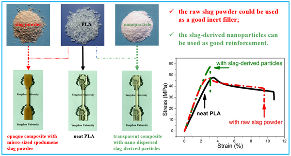 Nowadays spodumene ores become an important lithium resource. The generated slag, as the new member of slag family, would make the environmental burden mount up. Therefore, recycling of spodumene slag was studied in this work, with the objective of exploring the possibility of spodumene slag to be used as a common polymer filler. The microsized slag powder was firstly incorporated with polylactide (PLA) through solution mixing, followed by the injection molding, and the obtained composites were then studied in terms of morphology, rheological and mechanical properties, as well as creep and degradation behavior. The results reveal that the presence of slag powder enhances the system modulus evidently, while maintains normal strength level of PLA. Therefore, the slag powder can be used as a good inert filler in the polymeric material industry, with desirable reduction of cost. Then, the slag powder was further refined into nanoparticles, and again mixed with PLA. The results show that the presence of those nanoparticles increases both the modulus and strength remarkably because of their good dispersion and distribution in PLA matrix. As a result, those spodumene slag-derived nanoparticles can be used as a good reinforcement or as the active filler in the polymer additive industry. Both the slag powder and slag-derived nanoparticles highly restrain creep of PLA chain, while promote degradation of PLA remarkably. Therefore, those particles can be well used to tailor the final properties of PLA. In addition, a modified model was developed successfully to predict mechanical strength of as-obtained green composites. This work provides a new way to fabricate a novel green polymer composite with controllable performance by recycling of spodumene slag.