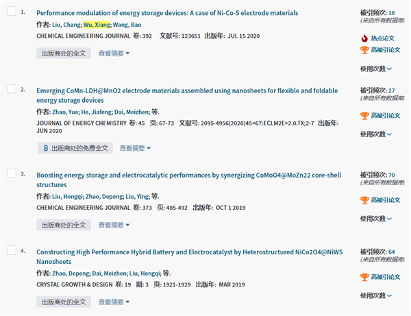 課題組新增高被引論文1篇:Chemical Engineering Journal 2020,392,123651。減少1篇:New Journal of Chemistry  2018,  42, 7399 - 7406。高被引論文總數(shù)仍然保持10篇。