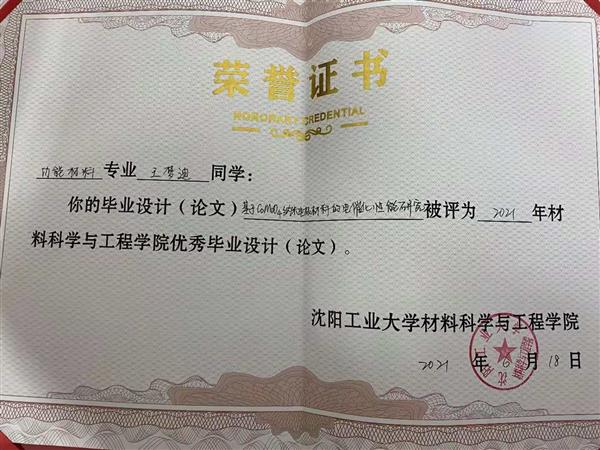 2017級功能材料專業王夢迪同學本科畢業論文獲得材料學院優秀畢業論文,祝賀!