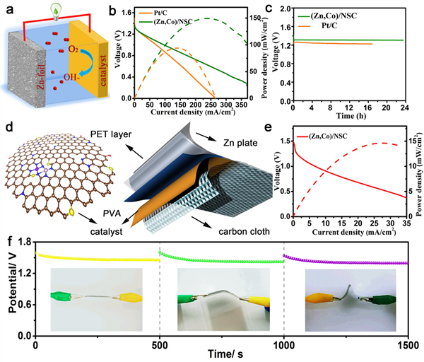 圖3 液態和柔性固態鋅-空氣電池的電化學表征(a)液態ZAB的示意圖。(b)使用(Zn,Co)/NSC和Pt/C催化劑的液態ZAB的極化和功率密度曲線。(c)使用(Zn,Co)/NSC和Pt/C作為空氣催化劑,在5 mA cm-2下的鋅-空氣電池的典型放電曲線。(d)柔性固體鋅-空氣電池的示意圖。(e)使用(Zn,Co)/NSC催化劑的柔性固體鋅-空氣電池的極化和功率密度曲線。(f)單(Zn,Co)/NSC-ZAB器件在不同彎曲角度下,以0.1 mA的恒定電流的放電曲線。