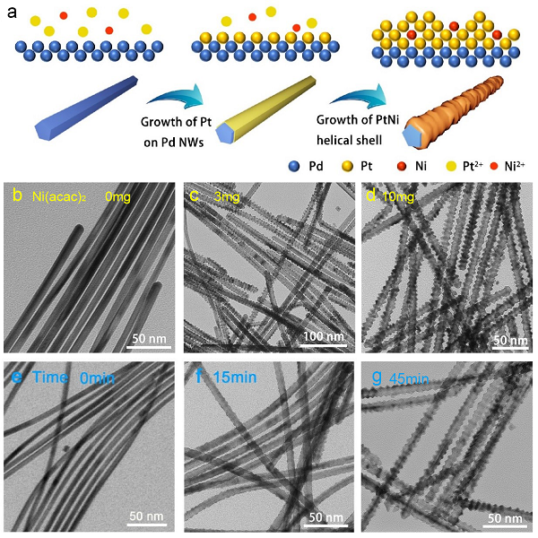 圖3. a)在單晶Pd納米線表面通過調節反應前驅體濃度及反應時間,實現Stranski–Krastanov 晶體外延生長方式,制備具有高指數晶面暴露的PtNi合金外殼示意圖。恒定Pt前驅體濃度后,當前驅液中加入不同量的乙酰丙酮鎳b)0 mg、c)3 mg和d)10 mg時形成的Pd@PtNi NWs產物透射電鏡圖。將前驅液乙酰丙酮鎳含量恒定為5mg時,調節不同反應時間e)15 min,f)45 min,g)75 min獲得的Pd@PtNi NWs產物透射電鏡圖。