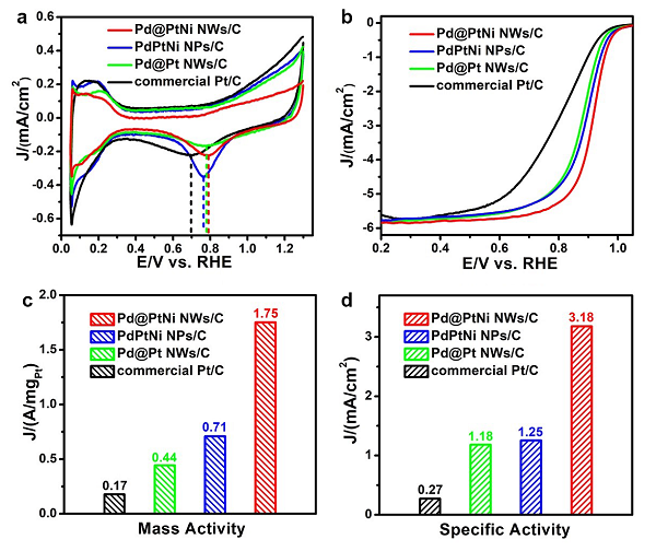 在催化氧還原反應酸性介質中對比商業碳載鉑及其他類似鉑基材料表現出明顯優勢: 此納米線催化氧還原反應的質量比活性是商業碳載鉑催化劑(0.17 A mgpt-1)的10倍,比活性是商業碳載鉑催化劑(0.27 mA cm-2)的12倍。Pd@PtNi-NWs獨特的納米結構:高指數PtNi合金外殼與一維核殼線性結構的巧妙組合能夠有效地提高催化氧還原反應的活性及穩定性。