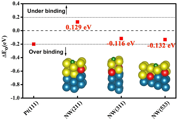 圖6. 利用密度泛函理論計算了Pd@PtNi核殼結構納米線表面的氧吸附能(E0)