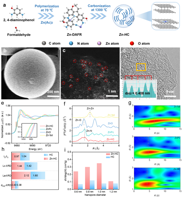 1. 構建調節良好的微結構通過高角度環形暗場掃描透射電鏡和同步輻射,證明Zn單原子被成功引入,并且均勻分布在硬碳基底上。通過Zn原子摻雜來調節硬碳的體相及表面結構,優化后的Zn-HC材料具有擴展的石墨區域(d002 = 0.408 nm)和高度發達的納米孔(直徑~0.8 nm)和更低的缺陷含量。