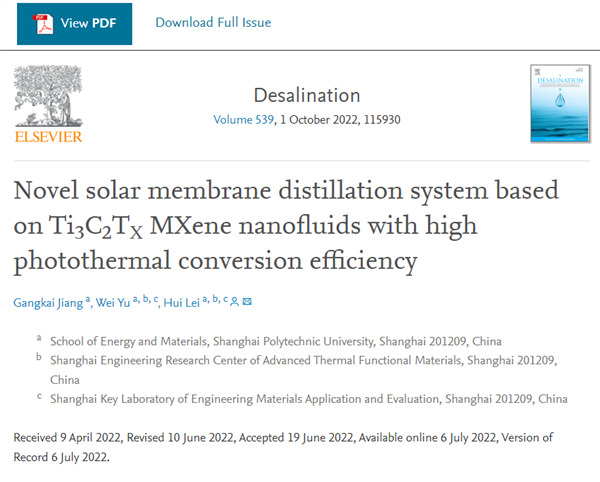 近日,上海先進熱功能材料工程技術研究中心于偉教授團隊在Desalination(脫鹽和海水淡化領域的國際知名期刊,IF=11.211)上發表了題為“Novel solar membrane distillation system based on Ti?C?T? MXene nanofluids with high photothermal conversion efficiency”的研究論文,將納米流體的光熱效應與膜蒸餾系統耦合,大幅提高了直接太陽能加熱膜蒸餾系統的水蒸發效率(提升90%)。該論文是以上海第二工業大學能源與材料學院為第一單位,碩士研究生蔣港凱為第一作者,上海第二工業大學高級工程師雷暉老師為通訊作者。