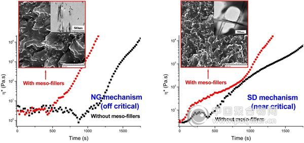 The “enhanced viscoelastic effect” of mesoscopic fillers is universal in different phase-separation systems as long as dynamic asymmetry exists. The slow parts are preferentially to chain entangle with mesoscopic fillers, and thus form refined network or enwrapped mesoscopic fillers depending on the location of mixture composition.