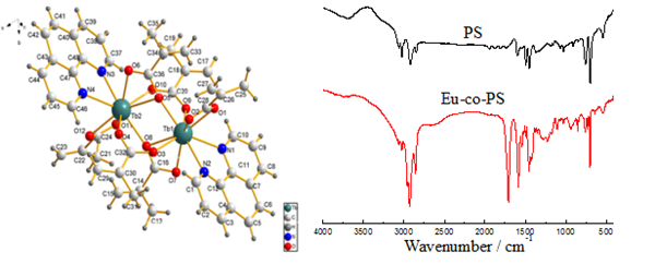 圖1是成功制備得到的稀土有機功能高分子單體的一種-Tb(MAA)3phen的單晶結構。圖2是采用鍵和方法得到的Eu-co-PS 熒光微球的紅外光譜圖。說明有機功能單體成功得到,且能夠得到共聚的熒光微球。
