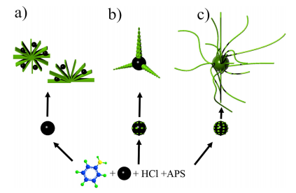 We demonstrated polyaniline (PANI) dimensional transformation by adding trace amino-Fe3O4 microspheres to aniline polymerization. Different PANI nanostructures (i.e., flowers, tentacles, and nanofibers) could be produced by controlling the nucleation position and number on the surface of Fe3O4 microspheres, where hydrogen bonding were spontaneously formed between amino groups of Fe3O4 microspheres and aniline molecules. By additionally introducing an external magnetic field, PANI towers were obtained. These PANI nanostructures displayed distinctly different surface wettability in the range from hydrophobicity to hydrophilicity, which was ascribed to the synergistic effect of their dimension, hierarchy, and size. Therefore, the dimension and property of PANI nanostructures can be largely rationalized and predicted by adjusting the PANI nucleation and growth. Using PANI as a model system, the strategies presented here provide insight into the general scheme of dimension and structure control for other conducting polymers.