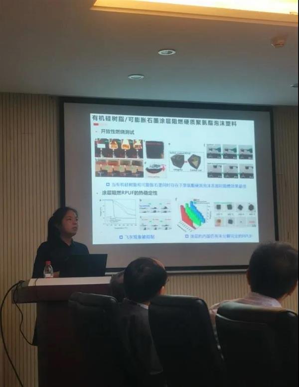王興國博士系統介紹了學位論文《新型磷-氮/金屬有機骨架阻燃體系的構筑及其對聚乳酸燃燒行為的影響機制》。針對聚乳酸阻燃中存在的問題設計并合成幾種新型阻燃劑,并對其阻燃機理進行詳細分析。王舒衡博士針對《有機硅樹脂/無機粒子阻燃模式的調控對聚合物燃燒行為的影響》系列工作展開介紹。系統的講述了不同添加模式下有機硅樹脂與無機粒子阻燃劑在多種基體中的燃燒行為以及阻燃性能,并通過有限元仿真再次驗證阻燃處理手段的有效性,為后續阻燃模式的設計提供指導。