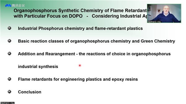 張勝老師介紹了演講嘉賓的背景和成就,主持了提問環(huán)節(jié),通過視頻感謝Doring教授的講解,并感謝線上業(yè)界同仁和老師同學的參與。他說,中國是磷儲存和生產(chǎn)大國,DOPO及其衍生物在阻燃行業(yè)發(fā)展中占有重要的地位,有機磷化學和綠色化學符合現(xiàn)代環(huán)??沙掷m(xù)發(fā)展的趨勢,希望本次報告能夠在疫情期間促進國內(nèi)外同行的交流,為中國阻燃行業(yè)注入創(chuàng)新發(fā)展新動力!