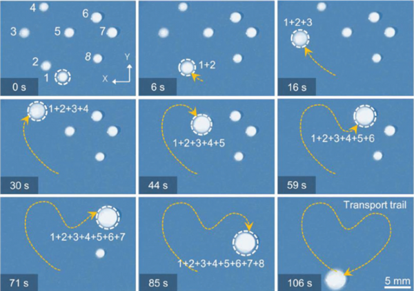 The authors demonstrate that a droplet of water can be pushed over their specialized surface to pick up 8 other droplets arranged in the shape of a love heart. They also show that liquids can be made to collect small bead of solid silica from one position and transport it to another (see below), opening the door to possible industrial applications.