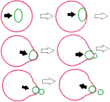 Cooperation of mother and daughter vesicles, which are self-assembled from an ill-defined hyperbranched copolymer, leads to fission of the daughter membrane in a cytomimetic process (see picture; red: mother vesicle, green: daughter vesicle). This is the first example of giant polymer vesicles (5–200 μm) being used as model membranes.