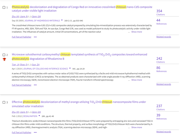 課題組2篇論文引用數(shù)位列殼聚糖基光催化材料領(lǐng)域全球前三名