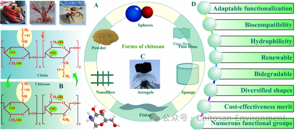 殼聚糖是一種天然衍生多糖,存在于某些真菌的細胞壁中,而商業殼聚糖可以從甲殼素中大量且經濟地制備。在自然界中,甲殼素是僅次于纖維素的第二大生物資源。殼聚糖基功能材料以其可再生性、多功能性和環境友好性,正成為解決環境污染、能源短缺與醫療需求的關鍵材料之一。通過持續的材料創新與跨學科合作,其應用潛力將進一步釋放。