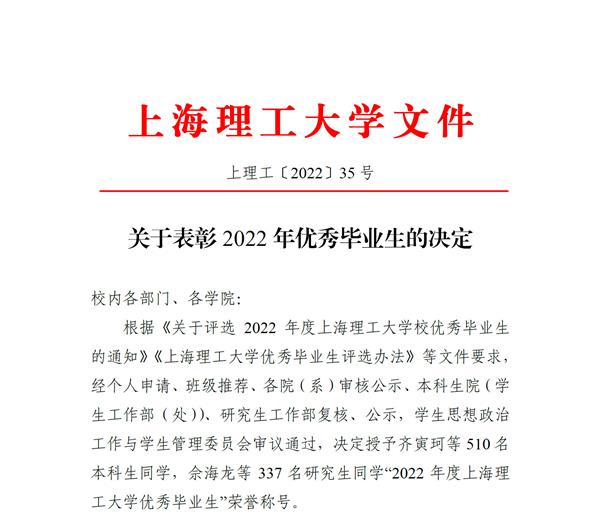 【2022.06.02】祝賀方霞同學被評為2022年度上海理工大學優秀畢業生