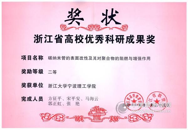 碳納米管的表面改性及其對聚合物的阻燃與增強作用, 浙江省高校科研成果獎二等獎, 浙江省教育廳/浙江省高等教育學會, 2011, 方征平,宋平安,馬海云,郭正虹,張艷